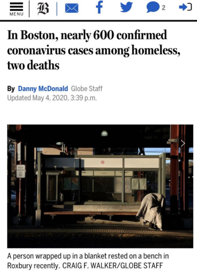 △《波士頓環(huán)球報》5月4日報道,近600名無家可歸者確診感染新冠肺炎