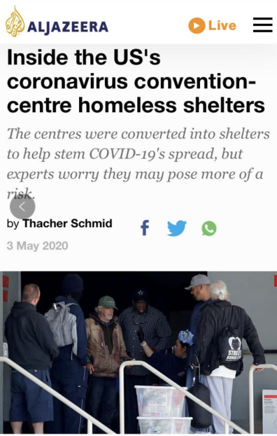 半島電視臺指出,在俄勒岡州、得克薩斯州和加利福尼亞州,無家可歸者睡在大到“可以覆蓋14個城市街區(qū)的設施中”。但盡管這樣,關鍵日?;顒又械纳缃痪嚯x依然無法保障?!叭藗冃枰蚕韼?你不可能讓他們互相保持6英尺(約2米),”加州大學舊金山分校弱勢人口中心主任瑪格特·庫舍爾認為,希望通過這些大型場所防止感染屬于“異想天開”。