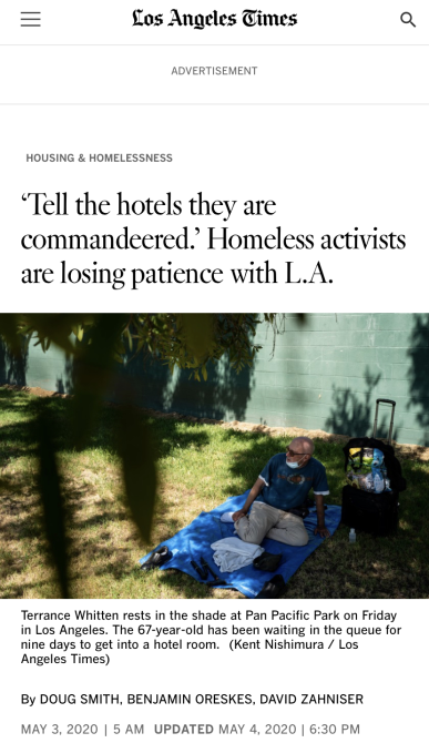 與收容所和大型會議中心比起來,租賃酒店為無家可歸者提供單獨房間是官員和專家均表示認可的最佳防疫方式。很多州也的確展開了與酒店的租賃合作?!堵迳即墪r報》指出,洛杉磯縣有大約60000無家可歸人口, 地方政府致力于將其中15000人遷入酒店進行防疫隔離,然而截至4月底,地方政府僅租到了2200間客房。情急之下,甚至有人士呼吁政府動用緊急權(quán)力,強行征用酒店和汽車旅館?!叭绻隳芤笳麄€洛杉磯居民都居家隔離,那你也可以告訴那些賓館他們要被征用,必須開門接納無家可歸者,”洛杉磯法律援助基金會律師莎拉·邁爾斯說。