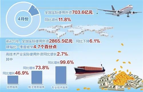 商務(wù)部最新數(shù)據(jù)顯示,4月份,全國實際使用外資703.6億元,同比增長11.8%(折合101.4億美元,同比增長8.6%)。1月份至4月份,受新冠肺炎疫情影響,全國實際使用外資2865.5億元,同比下降6.1%,比一季度降幅收窄4.7個百分點。