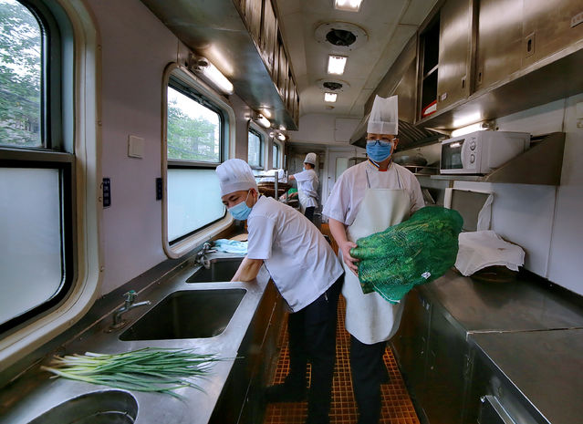 5月8日,成都開往北京方向的T8次列車餐車內(nèi),張森(右一)等工作人員在餐車搬運蔬菜。2008年,11歲的張森在都江堰讀小學(xué)5年級,父母在地震中不幸罹難。此后,張森與700余名震區(qū)孩子一起先后在山東日照和成都雙流學(xué)習(xí)生活6年。2014年,張森從職高畢業(yè)后,成為鐵路成都客運段的一名餐車炊事員。今年,新冠肺炎疫情暴發(fā),他們在自己的崗位上,保障旅客的飲食需求,參與疫情防控阻擊戰(zhàn)。蘇志剛/攝