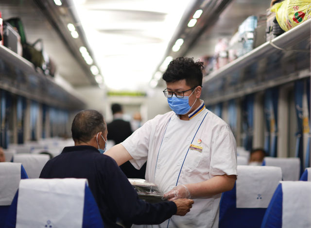 5月8日,成都開往北京西的T8次列車餐車內(nèi),張森為旅客送餐到座。疫情防控期間,列車餐車取消了桌餐。為方便旅客用餐,在飯點前,工作人員會來到車廂詢問旅客的訂餐需求。蘇志剛/攝