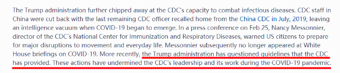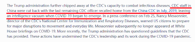文章說,特朗普政府對CDC工作能力的削弱在新冠肺炎疫情開始前就已存在。早在2019年7月,派駐中國疾控中心的最后一名CDC成員也被召回,這在很大程度上阻礙了兩國疾控中心間的溝通。
