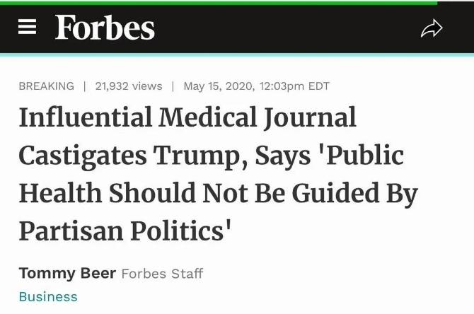 福布斯網(wǎng)站(Forbes)則以“頗具影響力的醫(yī)學(xué)雜志譴責(zé)特朗普,稱公共衛(wèi)生不應(yīng)受到黨派政治的指導(dǎo)”刊發(fā)了相關(guān)文章