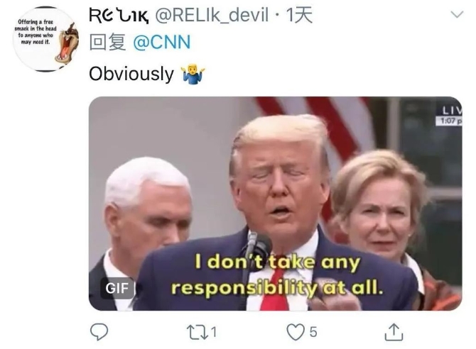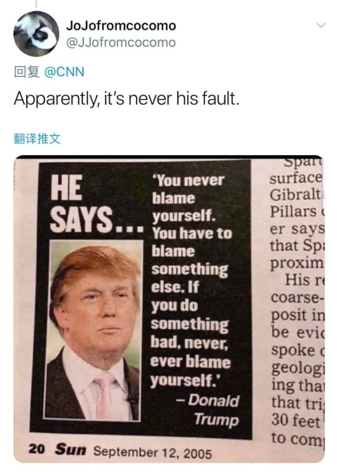 字幕:(特朗普)我不承擔(dān)任何責(zé)任。網(wǎng)友評論:顯而易見!