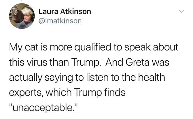 網(wǎng)友評論:我的貓都比特朗普有資格談?wù)撨@種病毒。它會聽從醫(yī)學(xué)專家的,但對特朗普來說卻是“不可接受的”。
