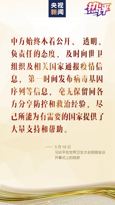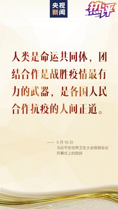 北京時間5月18日晚,習近平主席在第73屆世界衛(wèi)生大會視頻會議開幕式上致辭。這篇1700余字的致辭,闡述了中國的抗疫主張,體現了對科學規(guī)律的尊重,提出了全球團結合作抗疫的積極倡議。