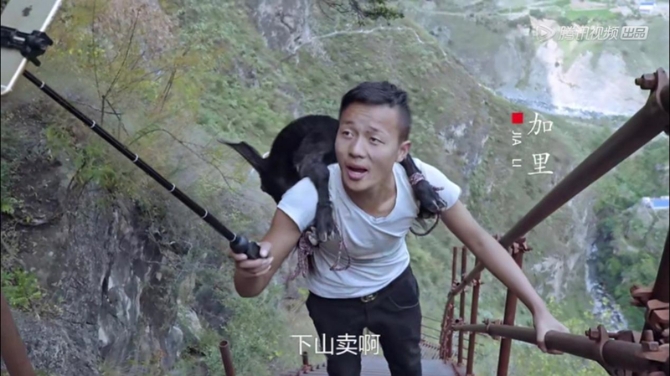 加里曾在“懸崖村”天梯上用4G網(wǎng)絡(luò)直播賣貨。圖片來自騰訊視頻紀(jì)錄片