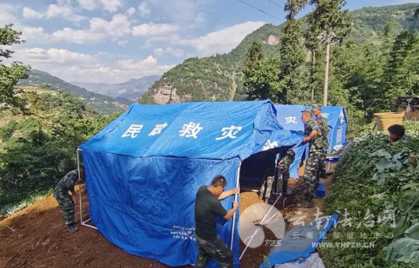 “一頂帳篷45公斤重,需要6人配合6人搭建?!蓖粢阏f,由于山路崎嶇難行,加上臨時搭建帳篷的地勢不平,官兵們還需要平整土地。