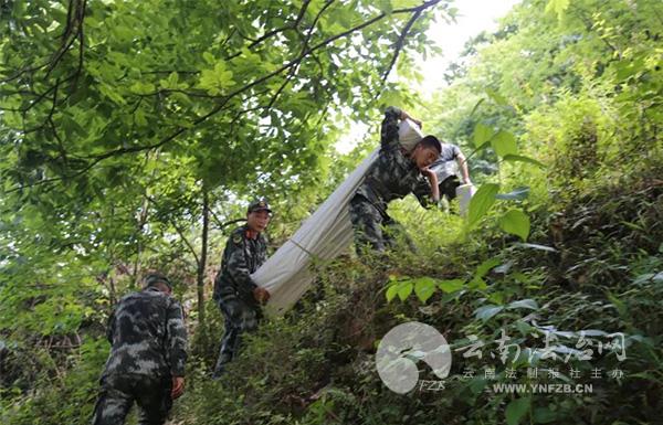 官兵們面對著山高路陡、樹高林密和37度的高溫,一直向著70度的山坡小心翼翼地艱難前行。