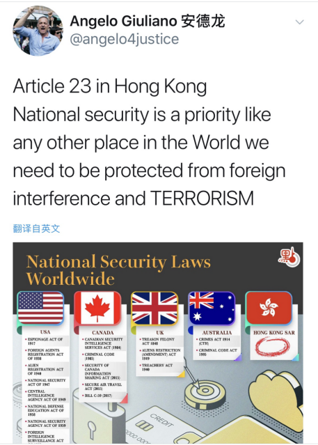 一位定居在香港的瑞士籍人士Angelo Giuliano(中文名安德龍)在社交媒體上發(fā)推表示:“就像這世界上所有地方一樣,針對(duì)香港的國(guó)安立法是最首要的,該法律能夠保護(hù)我們不受外國(guó)干涉和恐怖主義的威脅。”