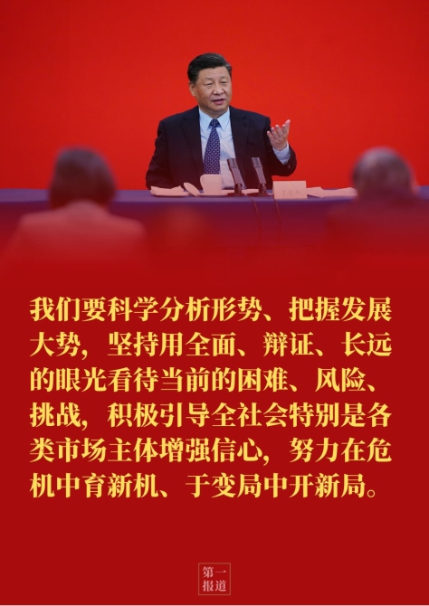 習(xí)近平強(qiáng)調(diào),我們要科學(xué)分析形勢(shì)、把握發(fā)展大勢(shì),堅(jiān)持用全面、辯證、長(zhǎng)遠(yuǎn)的眼光看待當(dāng)前的困難、風(fēng)險(xiǎn)、挑戰(zhàn),積極引導(dǎo)全社會(huì)特別是各類市場(chǎng)主體增強(qiáng)信心,努力在危機(jī)中育新機(jī)、于變局中開新局。