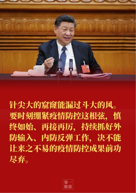 習(xí)近平指出:“針尖大的窟窿能漏過斗大的風(fēng)。要時(shí)刻繃緊疫情防控這根弦,慎終如始、再接再厲,持續(xù)抓好外防輸入、內(nèi)防反彈工作,決不能讓來之不易的疫情防控成果前功盡棄?!?/p>