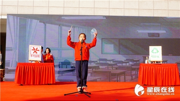 (芙蓉區(qū)燕山小學(xué)的學(xué)生帶來情景劇表演,傳播垃圾分類知識(shí)。通訊員 曹晶 攝)