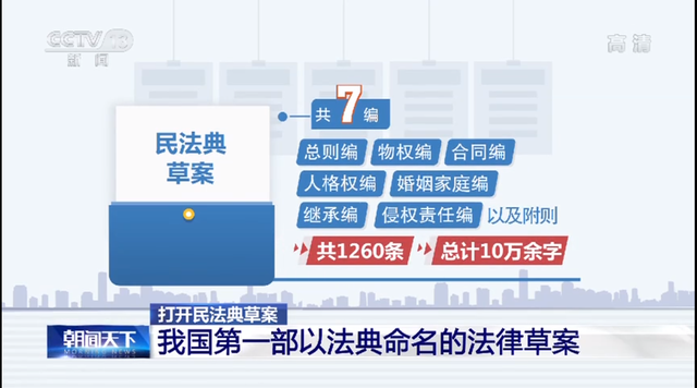 民法典草案共7編,依次為總則編、物權(quán)編、合同編、人格權(quán)編、婚姻家庭編、繼承編、侵權(quán)責(zé)任編,以及附則,共1260條,總計(jì)10萬余字,是新中國成立以來?xiàng)l文字?jǐn)?shù)最多的一部法律草案。