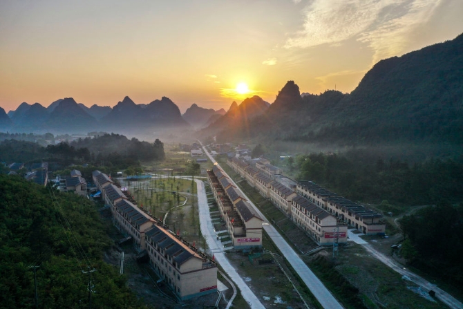 這是廣西南丹縣“千家瑤寨·萬戶瑤鄉(xiāng)”八圩瑤寨易地扶貧搬遷安置點(4月29日攝,無人機照片)。新華社記者曹祎銘攝