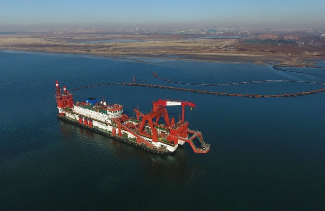 3月14日,一艘施工船在唐山港京唐港區(qū)25萬噸級航道工程海域施工作業(yè)(無人機拍攝)。新華社記者楊世堯攝