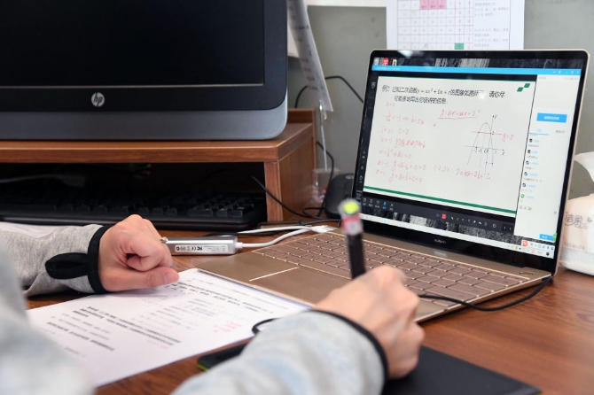 4月14日,在北京科技大學附屬中學,學生在線上初三數學課。新華社記者任超攝
