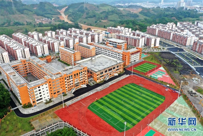 廣西環(huán)江毛南族自治縣毛南家園易地扶貧搬遷城北安置區(qū)新建的學(xué)校(5月21日攝,無人機(jī)拍攝)。 新華社記者 周華 攝