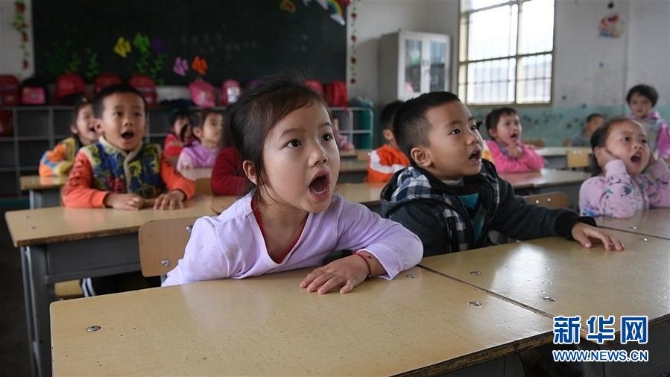 廣西融水苗族自治縣東陽村小學(xué)一年級(jí)學(xué)生在跟隨老師拼讀漢語拼音(2019年5月6日攝)。 新華社記者 張愛林 攝