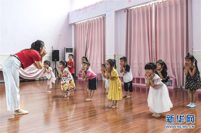 廣西興業(yè)縣城西幼兒園老師(左一)與小朋友們一起排練"六一"兒童節(jié)的節(jié)目(5月29日攝)。 新華社記者 曹祎銘 攝