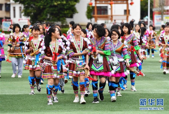 在廣西融水苗族自治縣民族中學(xué),女童班的學(xué)生們結(jié)束蘆笙排練后走向教室(2019年3月22日攝)。 新華社記者 黃孝邦 攝