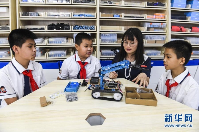廣西興業(yè)縣城西小學(xué)的老師(右二)給學(xué)生講解機(jī)器模型的有關(guān)知識(shí)(5月29日攝)。 新華社記者 曹祎銘 攝