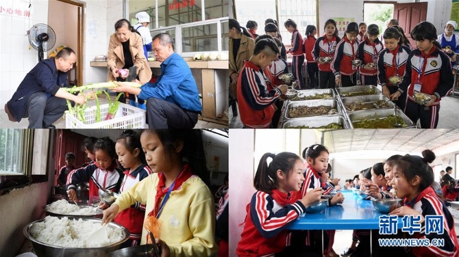 拼版照片:上左圖為在廣西融水苗族自治縣東陽村小學(xué),廚房師傅們?cè)跍?zhǔn)備午餐;上右圖、下左圖為廣西融水苗族自治縣東陽村小學(xué)學(xué)生在排隊(duì)打飯;下右圖為廣西融水苗族自治縣東陽村小學(xué)學(xué)生在吃午飯(2019年5月6日攝)。 新華社記者 張愛林 攝