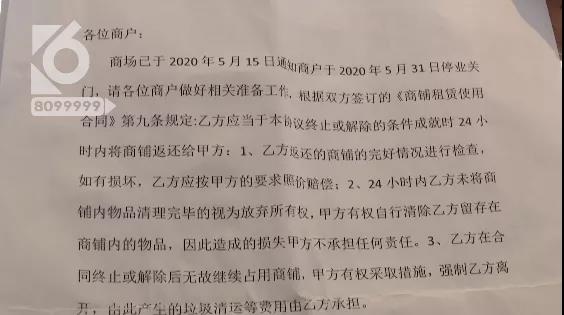 “商戶在我們這里的經(jīng)營合同期限已經(jīng)到了,在今年的2月份就已經(jīng)到期了,一個是合同已經(jīng)終止了,公司這邊和他們沒有合同關(guān)系,第二,從他們交納的租金上來看了嘛,從我們?nèi)ツ暌辉路蓍_業(yè)以來,一直都沒有按照合同交納過租金商戶這邊,然后到去年12月4日起,就再也沒有一分錢的租金,都沒有交納給公司這邊,所以公司這邊一直都堅持著,到現(xiàn)在已經(jīng)是沒有辦法在經(jīng)營下去了,所以合同關(guān)系早就結(jié)束了?!?/p>