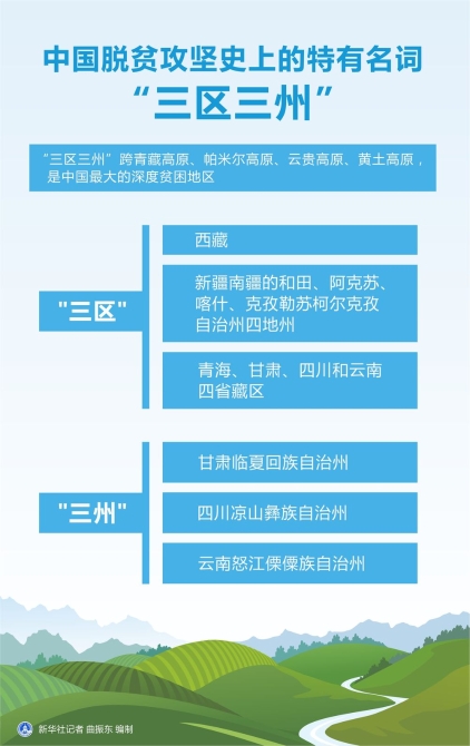 “三區(qū)三州”是中國脫貧攻堅史上的特有名詞?!叭齾^(qū)”,指西藏,新疆南疆的和田、阿克蘇、喀什、克孜勒蘇柯爾克孜自治州四地州,以及青海、甘肅、四川和云南四省藏區(qū)?!叭荨?則是指甘肅臨夏州、四川涼山州和云南怒江州。