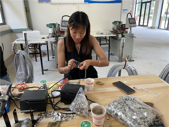 密珍花在云南怒江傈僳族自治州瀘水市大興地鎮(zhèn)維拉壩珠海社區(qū)數(shù)據(jù)線加工扶貧車間工作(6月1日攝)。新華社發(fā)