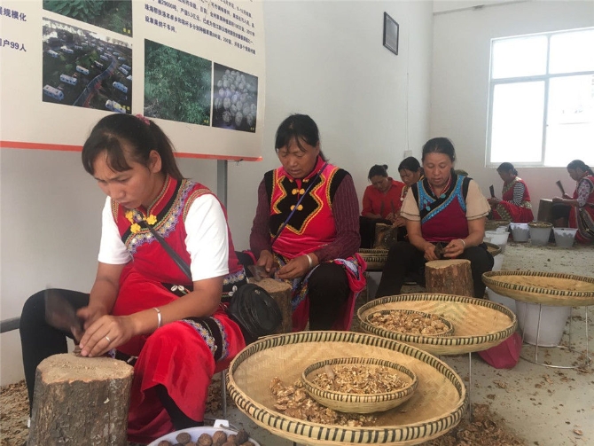 人們在云南怒江傈僳族自治州瀘水市大興地鎮(zhèn)維拉壩珠海社區(qū)核桃扶貧車間砍核桃(2019年6月24日)。新華社記者 楊靜 攝
