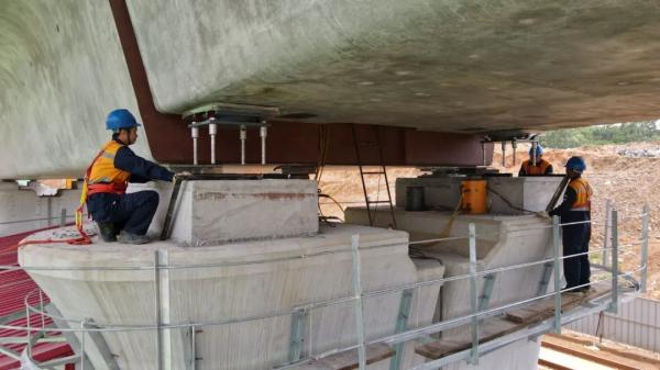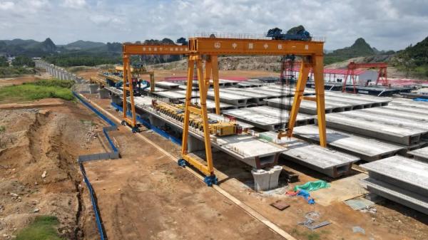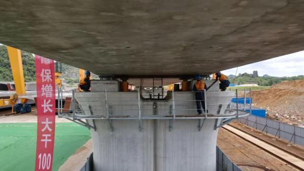 6月2日11時,在貴南高鐵廣西段伊嶺巖雙線特大橋箱梁架設(shè)現(xiàn)場,一榀長32.6米、重900噸的簡支箱梁被吊裝到指定橋墩的預(yù)接孔內(nèi),標(biāo)志著貴南高鐵廣西段南寧片區(qū)首榀箱梁成功架設(shè)。至此,貴南高鐵廣西段橋梁工程整體進(jìn)度過半,貴南高鐵離全線通車再進(jìn)一步。