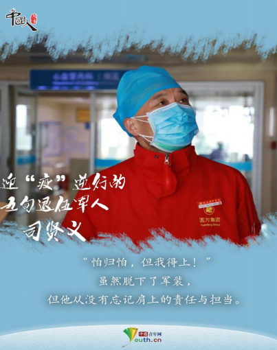 在抵達十堰市人民醫(yī)院項目部后,按照分工,他主要負責(zé)醫(yī)院外圍的機器噴灑消毒工作。但2月16日,原定于進入疫區(qū)隔離病房的同事因為防護服太小,穿不上,需要有人頂替?!拔沂菆A方的老黨員,退役軍人,我上!”得知消息,司賢義第一個沖了上去:“我一直有個英雄夢。脫了軍裝,我曾經(jīng)有一陣子覺得特別遺憾,再也沒有機會保家衛(wèi)國了,這可是軍人的光榮啊!但這回,我找著機會了,必須抓住!”