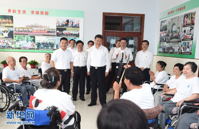 2016年7月28日,習(xí)近平總書記在河北唐山市截癱療養(yǎng)院活動室欣賞截癱傷員表演的二胡伴唱《唱支山歌給黨聽》。 新華社記者 謝環(huán)馳/攝