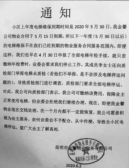工作人員說:“我們公司已經(jīng)跟??祷▓@北區(qū)合作了10多年,雖然合同即將到期,但這是屬于我們的本職工作。小區(qū)的電梯已經(jīng)使用了15年,每年都會進(jìn)行年檢,但是今年在準(zhǔn)備年檢工作的時候,小區(qū)業(yè)主委員會不配合我們工作,反對我們到市場監(jiān)管局繳費(fèi),所以導(dǎo)致最后電梯檢查延期進(jìn)行。”根據(jù)金馨物業(yè)服務(wù)有限公司6月2日粘貼的公告顯示,雖然該物業(yè)公司合同在5月15日已到期,但早在4月30日,物業(yè)方就申報了全部電梯年檢手續(xù)。