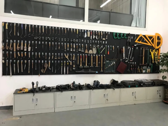 用電線管做成的固定工具、用牙刷做的刮膠用具、用繩子做成的紋飾成型工具、用切割片做成的拉縫工具……進(jìn)入修復(fù)室,一面很大的工具墻躍然入眼,上面分門別類、由大到小地陳設(shè)著各式各樣的工具。負(fù)責(zé)人董凱介紹說,這些工具多為張師傅親手所做,修復(fù)中需要什么,他就利用手邊的東西,隨手做個(gè)工具。文物具有唯一性,修文物的工具也多有這個(gè)特性,很多工具都是僅用一次就不再用了。一塊木板、一根鐵絲、一個(gè)廢舊的毛刷……在張師傅眼里,這都是寶貝?!斑@都用不了幾分鐘,很快的。馬上需要馬上做,馬上做了馬上就能用?!薄耙娏司拖胄?修了就想修好,修好了就開心。”談起自己的工作,他言語間滿是自豪與掩不住的熱愛。