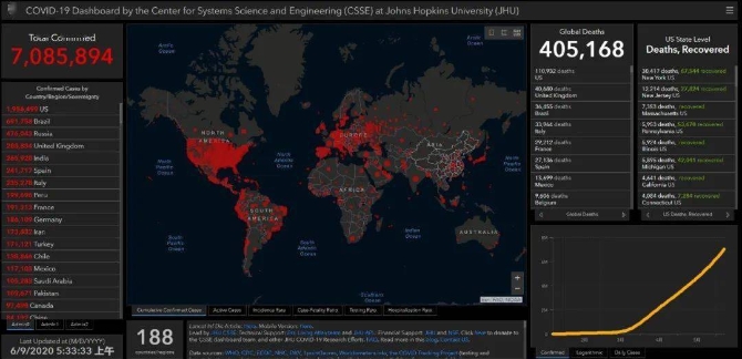 據(jù)美國約翰斯·霍普金斯大學發(fā)布的實時統(tǒng)計數(shù)據(jù)顯示,截至北京時間6月9日5時33分左右,全球累計確診新冠肺炎病例7085894例,累計死亡405168例。