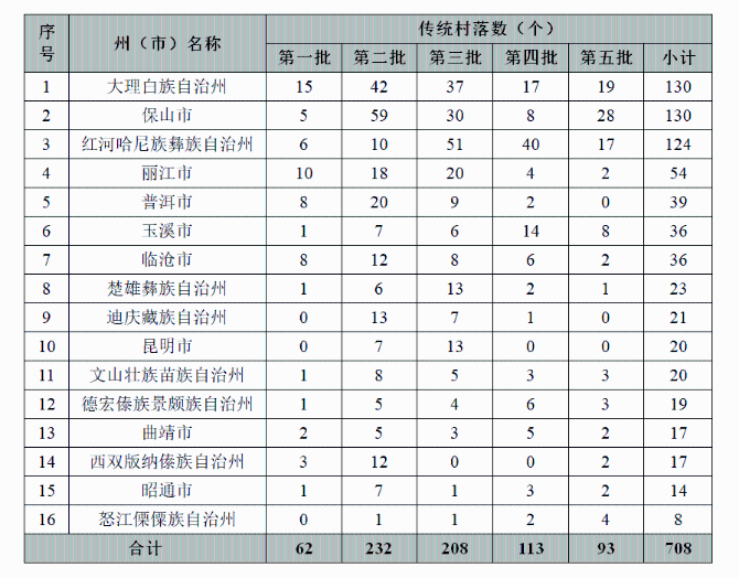 自2012年,云南啟動中國傳統村落申報工作以來,截至2019年底,經過7年五個批次的申報、認定和公布,云南共有708個村落入選中國傳統村落名錄,位居全國第二,數量占全國傳統村落總數的10.47%。