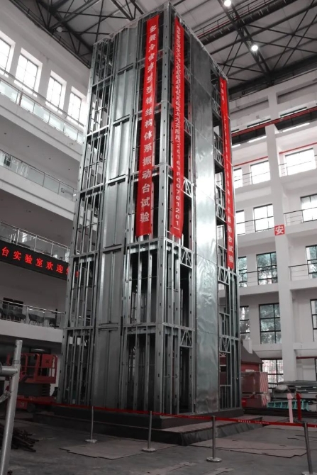 重慶大學(xué)振動(dòng)臺實(shí)驗(yàn)室凈高25.5米,臺面尺寸6.1米×6.1米、載重量60噸,可3向6自由度輸入地震,是國內(nèi)臺面尺寸、載重量和抗傾覆力矩最大的振動(dòng)臺之一。他們這次在振動(dòng)臺上搭建起了6層足尺寸實(shí)體冷彎薄壁型鋼結(jié)構(gòu)房屋,總高16.2米,長5.6米,寬4.2米。采用了鋼管端柱—雙面蒙皮鋼板剪力墻和夾支單層薄鋼板剪力墻兩種新型抗側(cè)力體系。與國內(nèi)外已經(jīng)完成的冷彎薄壁型鋼結(jié)構(gòu)的振動(dòng)臺試驗(yàn)對比,本次冷彎薄壁型鋼結(jié)構(gòu)振動(dòng)臺試驗(yàn)具有結(jié)構(gòu)體系新、結(jié)構(gòu)高寬比大、加載工況烈度高達(dá)8度罕遇狀況、分施工階段和正常使用兩個(gè)階段測試等一系列特點(diǎn)。