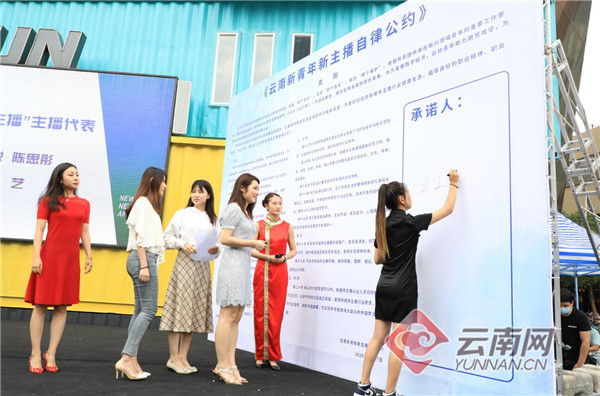 5名新青年新主播的主播代表共同宣讀了《云南新青年新主播自律公約》,并在新青年新主播自律公約上簽名,承諾自覺遵守新自律公約,共同構(gòu)建互聯(lián)網(wǎng)直播行業(yè)健康向上、文明清朗的生態(tài)圈,為推動我省高質(zhì)量發(fā)展貢獻(xiàn)青年力量。