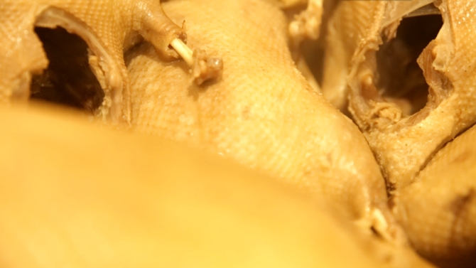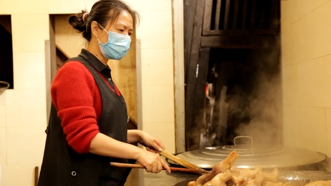 后廚幾口大鍋下?tīng)t火正旺,朱曉蘭的舅媽把鹵過(guò)了一遍的鴨子放進(jìn)鍋里依次碼好,又將調(diào)料鋪灑在鴨肉間,蓋上鍋蓋,二遍鹵起。灶下是紅通通的炭火,灶上是熱騰騰的蒸汽,構(gòu)成了這平凡生活里最動(dòng)人的煙火氣息。
