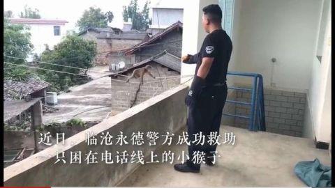 近日,臨滄市永德縣公安局森林警察大隊接到報警稱,一只猴子誤闖民宅,抓著電話線懸在高空,十分危險。