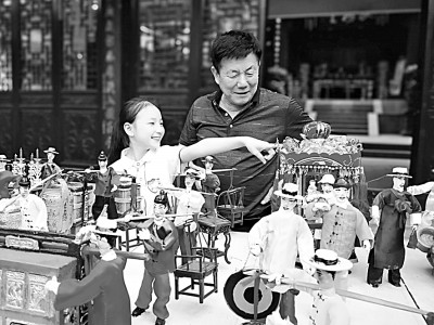 溫州龍灣首屆民俗文化節(jié)上,一對祖孫在觀賞傳統(tǒng)婚俗模型。陳賢寶攝/光明圖片