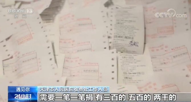 天津市人民醫(yī)院收費處 工作人員:需要一筆一筆捐,有三百的、五百的、兩千的,從晚上十點多一直交到凌晨一點多。