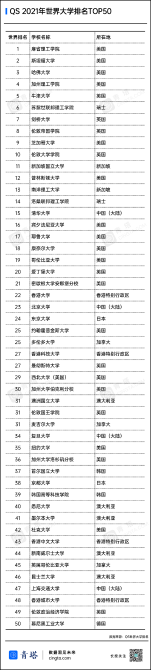 QS2021年世界大學(xué)排名TOP50高校名單如下: