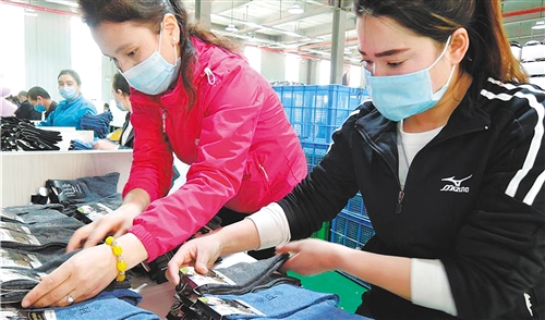 圖為在墨玉縣博斯坦工業(yè)園區(qū)新疆美凡華爾有限責(zé)任公司車(chē)間內(nèi),米日班·吾布力(右一)正在指導(dǎo)入廠不久的建檔立卡貧困戶米哈爾班·托兒堤麥麥提(左一)包裝襪子成品。 本報(bào)記者 馬呈忠攝