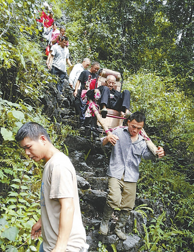 下南鄉(xiāng)下塘村,山外建好了易地扶貧搬遷的新居后,當(dāng)?shù)馗刹咳罕妼?1歲的譚運(yùn)日老人抬出大山。譚召關(guān)攝(新華社發(fā))