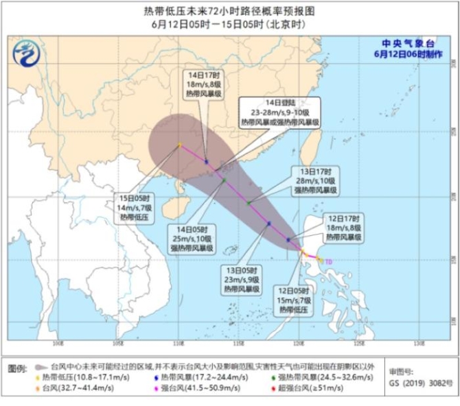 預(yù)計,低壓中心將以每小時15公里左右的速度向西北方向移動,將于今天中午前后進入南海,強度逐漸增強,將于24小時內(nèi)發(fā)展成為今年第2號臺風(fēng),并將于14日白天在廣東沿海登陸(23~28米/秒,熱帶風(fēng)暴級或強熱帶風(fēng)暴級),登陸后強度逐漸減弱。中央氣象臺6月12日06時發(fā)布熱帶低壓預(yù)報(見圖2)。