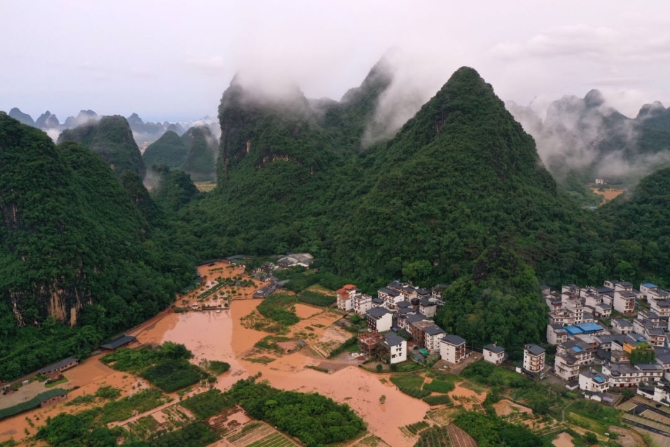 這是廣西陽朔縣部分出現(xiàn)嚴重積水的村莊(6月7日攝,無人機照片)。新華社發(fā)